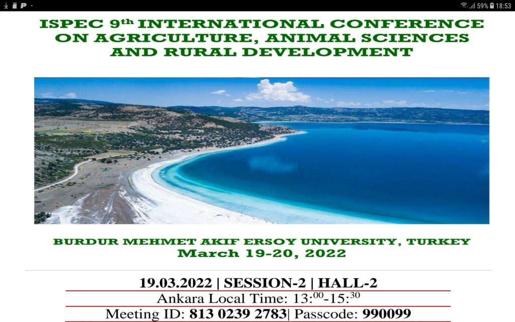 A 9-a Conferință internațională ISPEC privind agricultură, științe animale și dezvoltare rurală 19-20 martie 2022 Universitatea Burdur Mehmet Akif Ersoy Turcia